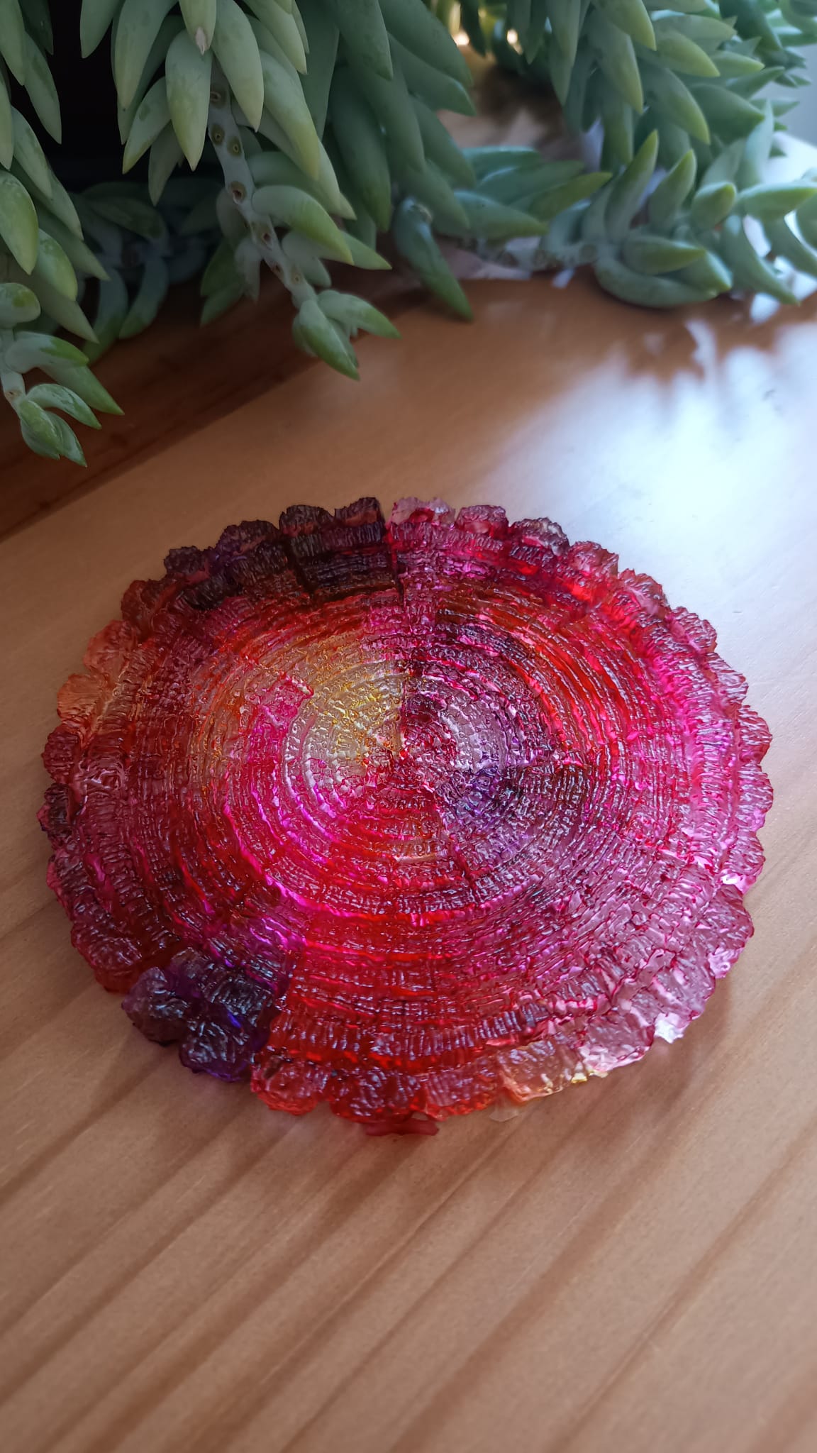 Cada pieza es única pues dependerá del material reciclable de ese momento. Puede servirte como posavasos, base para velas o vaciabolsillos, aportando un toque de naturaleza y sostenibilidad a tu espacio. Es un fragmento de mi artesanía, hecho con cariño y conciencia, para que empiece a formar parte de tu hogar.